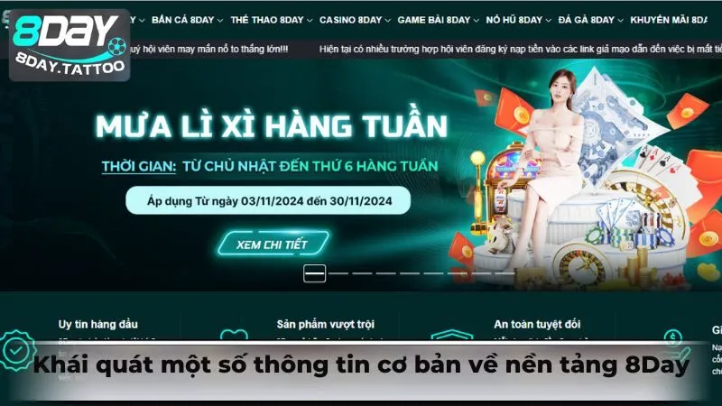 8Day chính thức xuất hiện lần đầu tiên vào năm 2020 và ngay từ khi mới đi vào hoạt động, nền tảng đã duy trì khẩu hiệu “Start A Day To Win”. Sân chơi cũng đã nhanh chóng gây được tiếng vang lớn không chỉ bởi những thông điệp ý nghĩa mà còn sở hữu hệ thống giao diện thân thiện, đồ họa đẹp mắt cùng sự đa dạng trong kho sản phẩm: Thể thao, casino, bắn cá,..